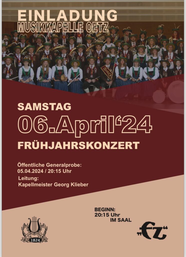 Die Musikantinnen und Musikanten der Musikkapelle Oetz laden zum Frühjahrskonzert 2024 in den Saal „Ez“ in Oetz ein. Am Samstag, den 6. April 2024 wird mit Beginn um 20:15 Uhr das abwechslungsreiche Programm, zusammengestellt von Kapellmeister Georg Klieber, dargeboten. Im ersten Teil werden neben der traditionellen Blasmusik auch jene zwei Werke vorgestellt, mit denen die Musikkapelle Oetz beim Wertungsspiel des Musikbezirkes Silz antreten wird. Im zweiten wird Solistin Patricia Plörer „Solfegietto“ vortragen. Ein Solostück für Klavier und Blasmusik. Mit dem Stück „James Bond Theme“ wird vor allem die Jugend angesprochen. Die Polka „Alte Zeiten“ vom Tiroler Komponisten Engelbert Wörndle bildet den Abschluss im Programm des Frühjahrskonzertes der MK Oetz.